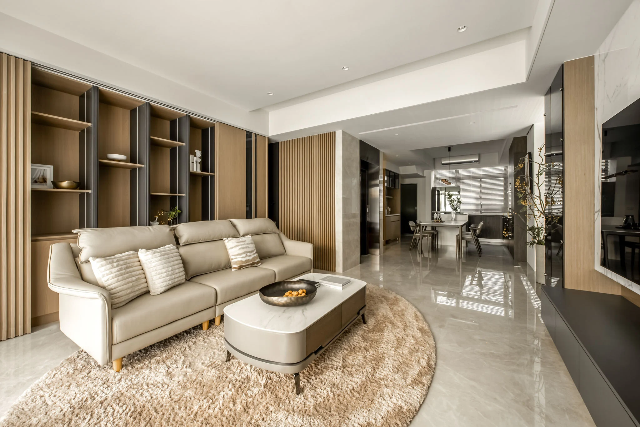 沙發前方的圓角矩形茶几採用白色石材檯面搭配深灰色木質基座,呼應了電視牆的材質配置。茶几下方的圓形米色絨毛地毯不僅界定出客廳的主要活動區域,其柔軟的觸感更為空間增添了一份溫暖與親和力。